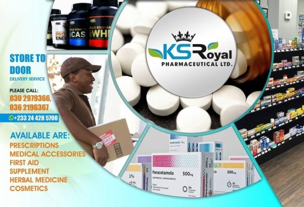 KS Royal Pharmacy offers a wide range of medical supplies. They are located at Ablekuma curve , Olebu vicolise junction, Manhie , Ashalaja and Kwabenya Comet police station opposite Stelling international school, and you can call or visit the store. Additionally, they offer 24-hour service and also provide delivery services across Accra. For more information, call 024 4285700.